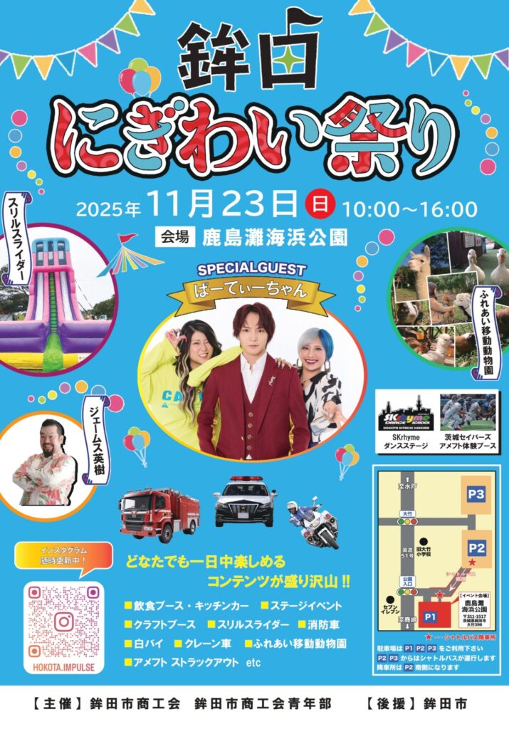 鉾田にぎわい祭り2025開催! 投稿日 2025年10月29日 カテゴリー お知らせ スペシャルゲストに「ぱーてぃーちゃん」を迎え、飲食ブースやスリルスライダーなど一日中楽しめるコンテンツ盛りだくさんでお待ちしています。秋の行楽シーズンに友人や家族を誘ってぜひお出かけください! ◆開催日時2025年11月23日(日)10:00〜16:00◆会場県立鹿島灘海浜公園(鉾田市大竹390)◆シャトルバス運行会場~大竹海岸駐車場の往復のみ Instagramwww.instagram.com 詳細:鉾田市商工会青年部インスタグラム 問合せ 鉾田市商工会青年部電話:0291-32-2246 ツイート