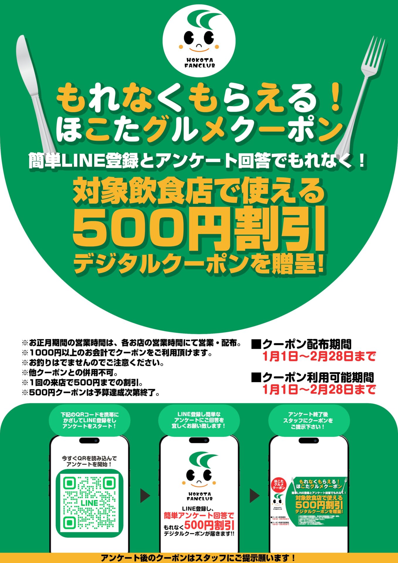 「ほこたファンクラブ」のLINEアカウントを友達登録してアンケートに答えると、市内飲食店で使えるデジタルクーポンをプレゼントします!